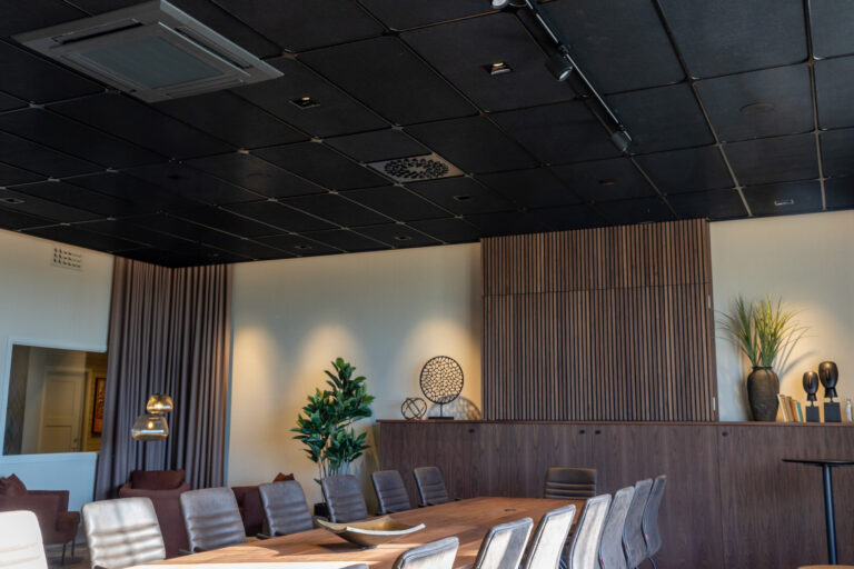 Das Projekt umfasst viele Elemente des Club of Sport-Konzepts: Sitzmöbel, Akustikpaneele, Pflanzen und Beleuchtung. In der Decke wurde das einzigartige Profilsystem AddOn Ceiling in Kombination mit der Deckenplatte Tiles installiert – eine einfache und stilvolle Möglichkeit, eine ansonsten schlichte Decke aufzuwerten. Von der Decke hängt Off the Grid, an den Wänden befinden sich bedruckte Akustikelemente, und auf dem Boden sorgen Pflanzgefäße mit künstlichem Grün für zusätzliche Wohlfühlatmosphäre. Als Konferenzstuhl fiel die Wahl auf den bequemen Apollo-Stuhl von Scan Sorlie. So entsteht ein angenehmes Konferenzerlebnis für die Gäste.